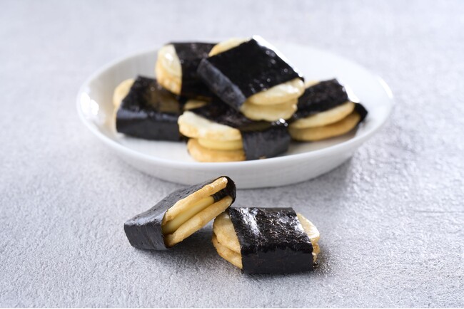 杵搗きおかきと海苔でまろやかなチーズクリームをサンドしました。チーズクリームがほんのり甘いため、お召し上がりやすくお子様からご年配のかたまでご支持いただいている商品です。