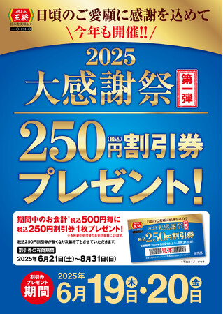 株式会社王将フードサービス(本社 京都府京都市 代表取締役社長 渡邊直人)は、日頃より餃子の王将をご愛顧くださっているお客様へ感謝の気持ちを込めて、「大感謝祭」を開催いたします。