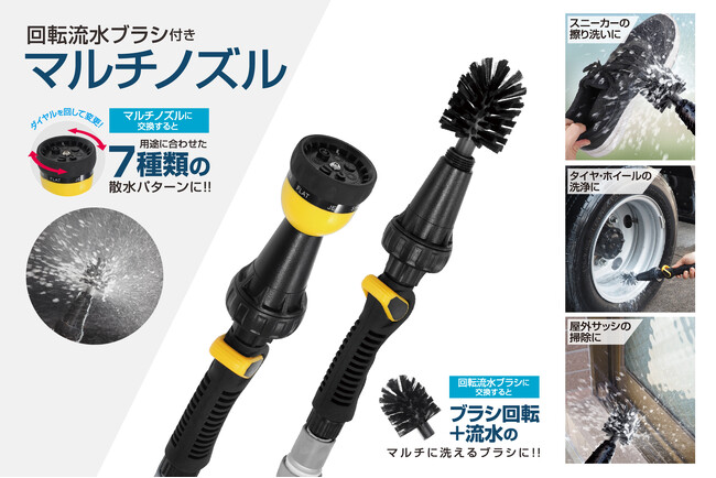 付属の回転ブラシはタイヤのホイールや、窓枠などのしつこい泥汚れの掃除にぴったり。普段使いに嬉しいマルチノズルと使い分けて隅々までキレイに!