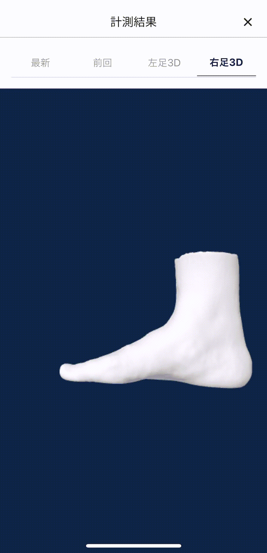 「3D足形計測データ」は、アプリ上で最大4種のデータが保存されるようになっており、「INFOOT 2」の計測結果2回分のほか、左右の3Dの足形画像を確認することができます。