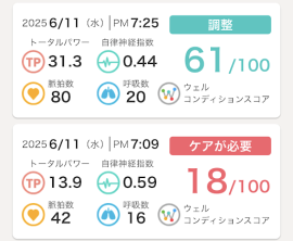 KAORIUM*で好きな香りと判定された「ベルガモット」を嗅いだ後、ウェルコンディションスコアが61、トータルパワー31.3となり、それぞれ大幅に上昇した。「基本的にAIは嫌い、特にAIの文章は嫌いだが、アロマオイルなど選択肢がたくさんあって選べないときに、今回のようにAIが提案してくれるのはいいと思う。自分にはない気づきがあるのは助かる」という。