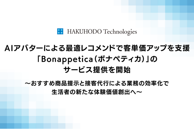 株式会社博報堂テクノロジーズ(本社:東京都港区、代表取締役社長:米谷 修、以下博報堂テクノロジーズ)は、生成AIの特性を活用して、飲食店や施設の接客業務を高度化し、売上アップと業務効率化を支援するAIアバターソリューション「Bonappetica(ボナペティカ)」(以下、本サービス)のサービス提供を開始いたしました。