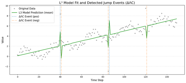 灰色の点は、基礎トレンドに加え、t=30, 80, 110にジャンプ(急変)を加えた合成時系列データ。緑の線は、L³モデルの予測平均。青の破線が正のジャンプ(ΔΛC_pos)、オレンジの破線が負のジャンプ(ΔΛC_neg)を示す。モデルはトレンドと各ジャンプイベント(正負両方)を明確に分離・定量化できている。
