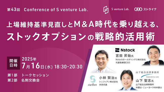 株式会社ストライク(本社: 東京都千代田区、代表取締役社長: 荒井邦彦)は、2025年7月16日(水)に、スタートアップと事業会社の提携促進を加速するイベント第43回『S venture Lab.』をTokyo Venture Capital Hubとオンラインのハイブリッド形式で開催いたします。