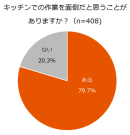 今回の調査で、キッチンでの作業を面倒だと思うことがあるか尋ねたところ、「面倒に思う」と回答した方が79.7%、「面倒に思わない」が20.3%でした。キッチンで行うさまざまな作業を「面倒に思う」方が8割近くと大多数に及ぶことがわかりました。