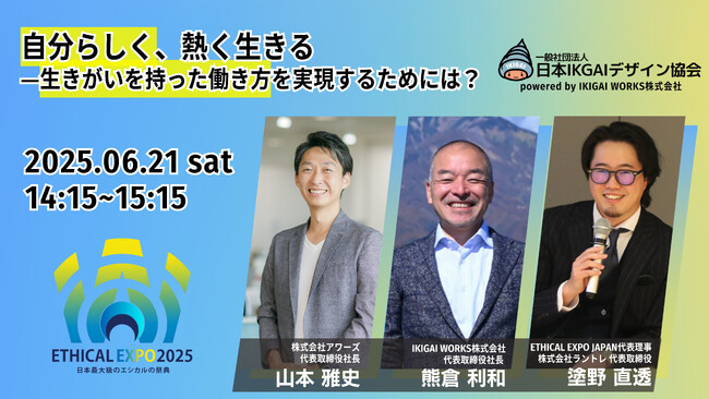一般社団法人ETHICAL EXPO JAPAN(代表理事:塗野 直透)は、2025年6月21日(土) 、22日(日)にグランフロント大阪北館1階 ナレッジプラザにて、日本最大級のエシカルの祭典「エシカルエキスポ2025 OSAKA」を開催いたします。本イベントスポンサーである「一般社団法人日本IKIGAIデザイン協会」がプロデュースした、2つのトークセッションがステージにて行われます。