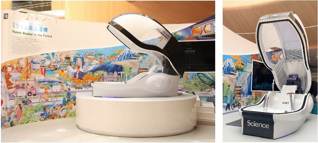 2025年大阪・関西万博 大阪ヘルスケアパビリオン出展の「ミライ人間洗濯機」※画像は展示モデル(サイエンス提供)今回開発中の介護施設向け入浴機器は、同技術(マイクロバブル技術)を応用したものです。