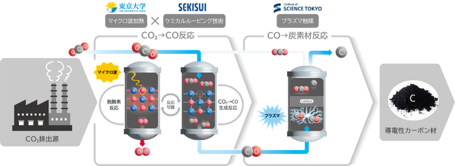 積水化学工業株式会社(代表取締役社長:加藤敬太、以下「積水化学」)、国立大学法人東京大学(総長:藤井 輝夫、以下「東京大学」)、国立大学法人東京科学大学(理事長:大竹 尚登、以下「東京科学大学」)は、NEDO(国立研究開発法人新エネルギー‧産業技術総合開発機構)の委託事業「カーボンリサイクル・次世代火力発電等技術開発/CO2有効利用拠点における技術開発/研究拠点におけるCO2有効利用技術開発」に共同で応募し、「水素不使用高エネルギー効率CO2由来導電性カーボン材大規模製造技術の研究開発」の実施先として採択されました。