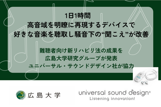 ユニバーサル・サウンドデザイン株式会社(本社:東京都港区 代表取締役:中石 真一路 、以下『ユニバーサル・サウンドデザイン』)聴脳科学総合研究所は、広島大学大学院医系科学研究科および広島大学病院の研究グループが感音性難聴者を対象に行った、明瞭度の高い音(明瞭聴取音)を用いた「音楽聴取を活用した聴覚リハビリ」の効果実証において、高明瞭化音響デバイスを提供し協力いたしました。
