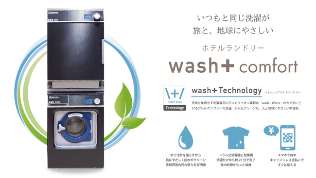 全国で急速に導入が進む最先端ホテルランドリー「wash+ Comfort」は、「洗剤を使わない洗濯」でSDGsに貢献するだけでなく、IoTシステムを標準装備し省人化に貢献する最先端のホテルランドリーです。