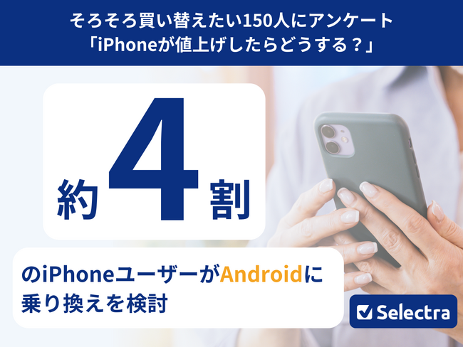 セレクトラ・ジャパン株式会社(本社:東京都渋谷区、代表取締役:グザビエ・ピノン)は、iPhoneユーザー男女150名を対象に、iPhoneの値上げによるAndroid乗り換え意向調査を実施しました。