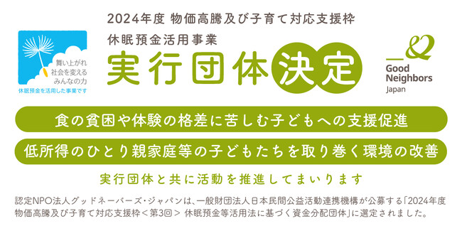 認定NPO法人グッドネーバーズ・ジャパン(本部:東京都大田区、代表理事:小泉 智)は、一般財団法人日本民間公益活動連携機構(所在地:東京都千代田区、理事長:二宮 雅也、英文名:Japan Network for Public Interest Activities、略称:JANPIA)の「2024年度 物価高騰及び子育て対応支援枠<第3回> 休眠預金等活用法に基づく資金分配団体」として、子どもの食の貧困・体験の格差是正に取り組む実行団体を採択いたしました。
