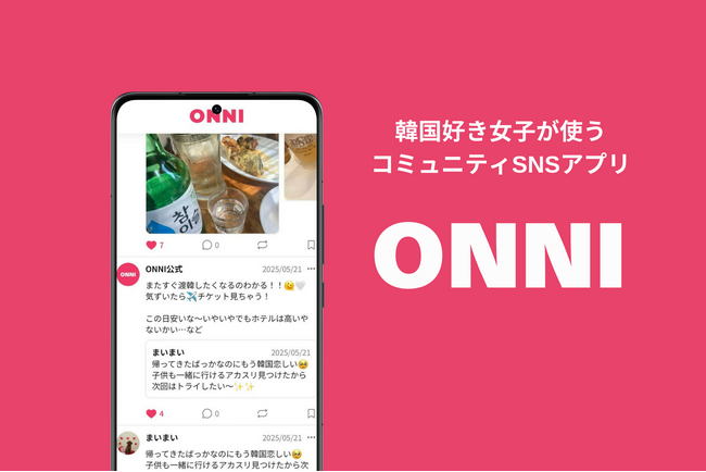 『ONNI-オンニ-』は、韓国をこよなく愛する女性が、ひとり渡韓で直面する食事の不自由さや美容情報の散在といった悩みをまとめて解決するコミュニティ SNS アプリです。同じ日程・エリアで渡韓する仲間を気軽に見つけ、現地のグルメや韓国美容についてリアルタイムで情報交換ができます。