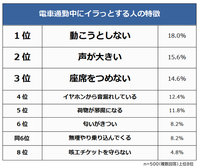 【電車通勤中にイラッとする人の特徴ランキング】男女500人アンケート調査