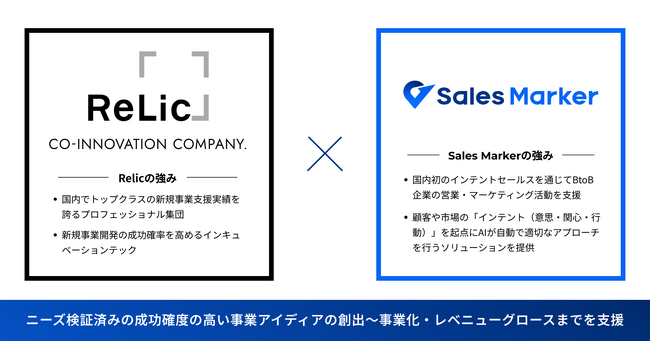 本提携では、Sales Markerが開発・提供する、顧客や市場の”インテント”(意思・関心・行動)を起点にAIが自動で適切なアプローチを行う複数のプロダクトと、Relicが提供する、新規事業開発の成功確率を高めるインキュベーションテックを組み合わせることにより、ニーズ検証済みの成功確度の高い事業アイデアの創出から、事業化・レベニューグロースまでを支援することで、企業の持続可能なビジネス成長を後押ししてまいります。