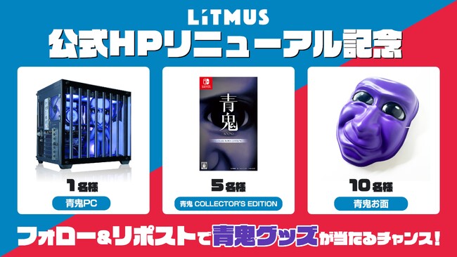 ホラーゲーム『青鬼』シリーズや非対称型アクションゲーム『脱獄ごっこPRO』など多様なゲームコンテンツを企画・開発・運営するLiTMUS株式会社(本社:東京都港区、代表取締役社長:桑村 崇一郎、以下「LiTMUS」)は、6月20日、コーポレートサイトを全面リニューアルしましたことをお知らせします。 リニューアルを記念して『青鬼』のゲーミングPCやNintendo Switch(TM)パッケージ版『青鬼 COLLECTOR’S EDITION』などの「青鬼グッズ」が抽選で合計16名様に当たるキャンペーンを実施します。LiTMUSは、今後も「やって楽しい みて楽しい」ゲームを制作してまいります。この機会にぜひ、新しいコーポレートサイトをご覧ください。