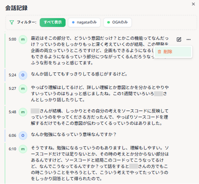 一方で、1on1にはプライベートな内容も含まれるため、「全ての議事録が保存されることへの懸念」という声も一部から寄せられていました。そこで今回、ユーザー自身が議事録に残す内容を選択できる「会話記録機能」を新たに搭載。編集と削除ができる仕組みにより、安心してご利用いただける設計となっています。