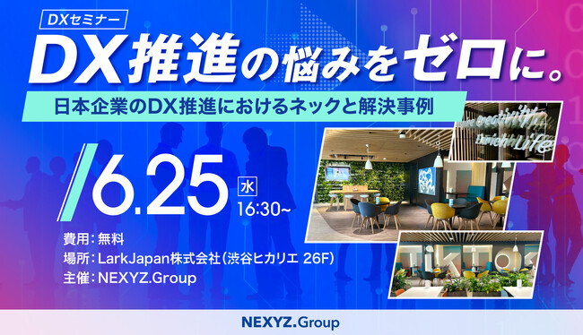 株式会社NEXYZ.Group(本社:東京都渋谷区 代表取締役社長兼グループ代表 近藤太香巳 証券コード:4346 以下、当社)は、日本企業・業界のDX推進を目的とし、次世代コラボレーションツール「Lark」の公式プラチナパートナー(最高位)として、Lark Japan(渋谷ヒカリエ)でのDX推進セミナーを開催します。