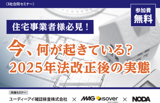 株式会社ノダ(本社:東京都台東区浅草橋、代表取締役社長:野田 励)は、確認検査機関・素材メーカー・ソフトウェア会社など、業界の枠を超えた企業と連携し、建築事業者様向けの無料オンライン合同セミナーをシリーズ開催します。法改正で加速する省エネ・構造性能の高度化や業務DXなど、現場ニーズの高いテーマを継続的にお届けしてまいります。