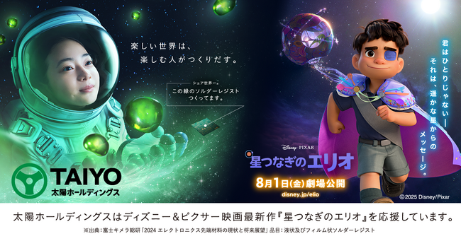 太陽ホールディングス株式会社(本社:東京都豊島区、代表取締役社長:齋藤 斉、証券コード:4626、以下「太陽ホールディングス」) は、ディズニー&ピクサー映画最新作『星つなぎのエリオ』公開を記念して、期間限定タイアッププロモーションを実施いたします。期間限定TVCMは、2025年8月1日より全国映画館にて公開される映画『星つなぎのエリオ』の公開に先立ち、6月23日より放映を開始します。また、同日より公開するタイアップキャンペーン特設サイト(https://www.taiyo-hd.co.jp/lp/brand/)で太陽ホールディングス主催、ディズニー&ピクサー映画最新作『星つなぎのエリオ』の「太陽ホールディングス主催 特別試写会」または「ムビチケ」のペアチケットが抽選で合計20組40名様に当たるキャンペーンを開始します。