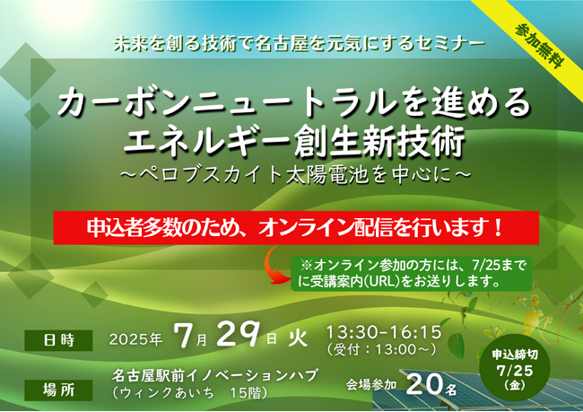 【オンライン併催決定!!】7月29日(火)未来を創る技術で名古屋を元気にするセミナー カーボンニュートラルを進めるエネルギー創生新技術 -ペロブスカイト太陽電池を中心に -