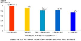 *3 ハザード比(hazard ratio): 関連の強さを表す統計学的な指標。基準とした群と比べて、ある群のハザード比が1を下回っているということは、ある群のリスクは基準とした群と比べて低いことを意味する。今回の研究では、とても不健康な生活を続けた群を基準として、とても健康的な生活を維持した群のハザード比は0.74と1を下回っている。この結果は、とても不健康な生活を続けた群と比べて、とても健康的な生活を維持した群の前糖尿病の発症リスクは約3/4倍(0.74倍)であったことを意味する。