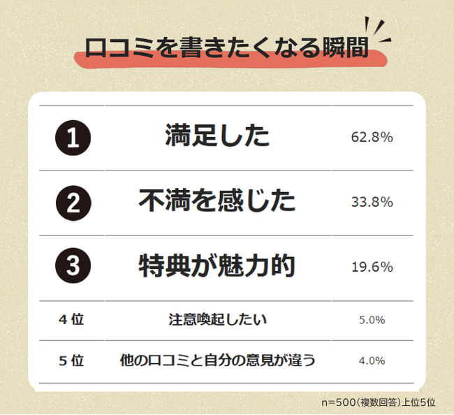 口コミを書きたくなる瞬間1位は「満足したとき」