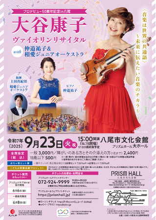 日本を代表するヴァイオリニストとして国境を越えた演奏と後進指導活動の傍ら、BSテレ東「おんがく交差点」へレギュラー出演するなど、「音楽」をキーワードにマルチに活躍する大谷康子のプロデビュー50周年記念の取り組みとして、八尾市文化会館(指定管理者:(公財)八尾市文化振興事業団・大阪府)が大谷氏とタッグを組み“これから未来を生きていく人たちに“音楽のチカラ”を伝えたいという思いで企画するリサイタルです。