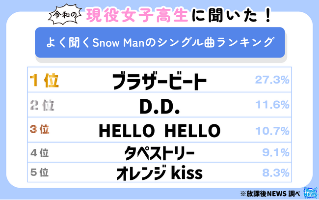 【令和の現役女子高生に聞いた!よく聞くSnow Manのシングル曲ランキング】