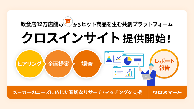 食品流通のDX(デジタルトランスフォーメーション)を推進するクロスマート株式会社(本社:東京都中央区、代表取締役:寺田 佳史、以下「当社」)は、2025年7月より、業務用食品・飲料メーカー向けのリサーチサービス「クロスインサイト」の提供を開始します。