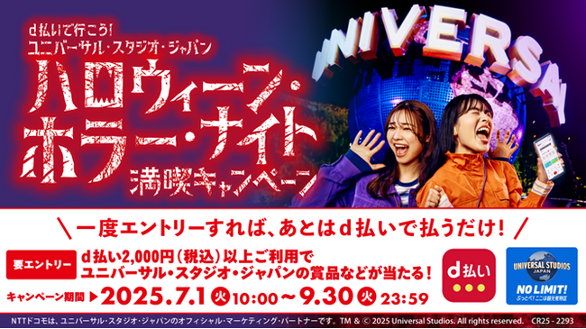 株式会社NTTドコモ(以下、ドコモ)は、全国の街のお店・ネットのお店※1で「d払い(R)」※2をご利用したお客さまを対象に、「ユニバーサル・スタジオ・ジャパン1デイ・スタジオ・パス(ペア)」や「dポイント(期間・用途限定)1,000ポイント」が抽選であたる「d払いで行こう!ユニバーサル・スタジオ・ジャパン ハロウィーン・ホラー・ナイト 満喫キャンペーン」(以下、本キャンペーン)を2025年7月1日(火)から2025年9月30日(火)までの期間で開催いたします。