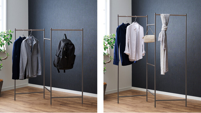 ハンガーラックとしても使える2WAY仕様普段使いの衣類掛けにも便利。多様なライフスタイルに対応。