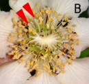 キウイフルーツの雌花には約40本の柱頭が存在します(図2A)。本研究では、柱頭を部分的に切除し(図2B)、人工受粉を「一部の柱頭のみに行う」ことで、種子の分布や果実成長と品質などにどのような影響が出るかを調査しました。