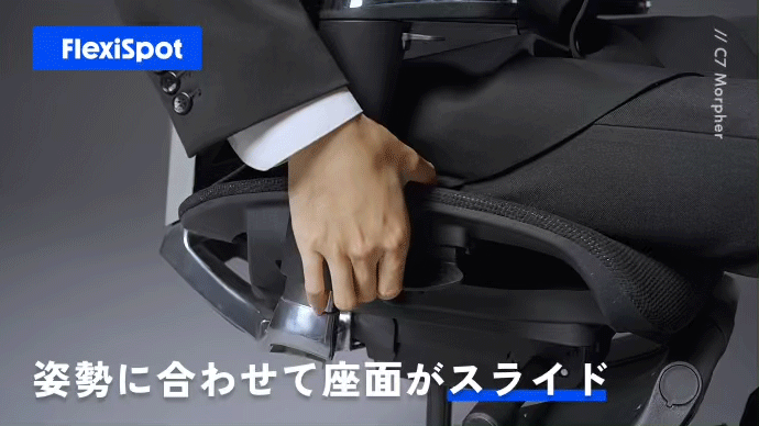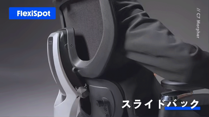 C7 Morpherはスライド式独立型セパレート構造の腰背サポートシステムを搭載し、仙骨部をしっかりと支えながら、あなたの動きに寄り添います。リクライニング時もスライドバック機能により、ランバーサポートの角度が連動して変化し、常に腰をサポートします。