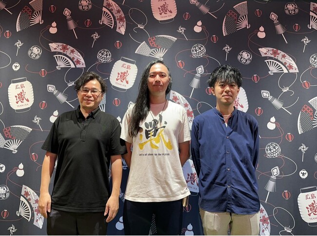 開発を担当する株式会社エボルブ(大阪府)の清水則友(左)・舛谷康太朗(右)と、プロeスポーツチーム「広島 TEAM iXA」を運営するヤルキマントッキーズ株式会社(広島県)の板垣 護代表(中央)。広島県内で行われたキックオフミーティングにて撮影。