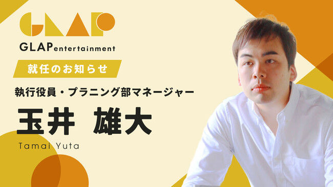 株式会社GLAPentertainment(本社:東京都渋谷区、代表取締役:坂本大輔)は、2025年7月1日付で玉井雄大(たまい ゆうた)が執行役員兼プラニング部マネージャーに就任したことをお知らせいたします。玉井はこれまで培ってきた広告とエンタメコンテンツ領域での経験を活かし、GLAPのさらなる事業成長と組織体制の強化を担います。