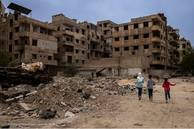 紛争の爪痕が残るダマスカス郊外県の街をきょうだいと一緒に走る11歳のバシマさん。不発弾の危険性を学び、弟が家に持ち帰っていた薬きょうを安全に処分するように説得した(シリア、2025年4月10日撮影) (C) UNICEF/UNI790024/Ibarra Sanchez / MeMo