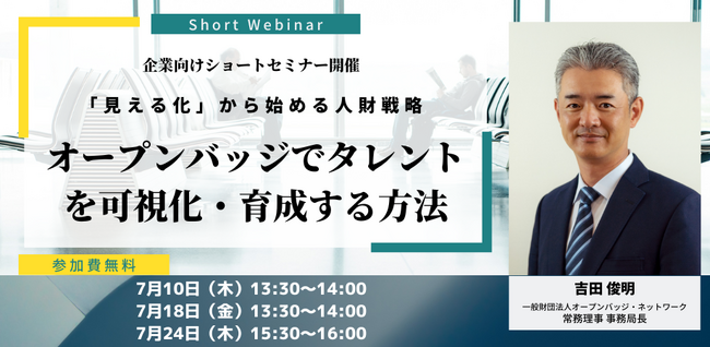 この度、オープンバッジの概要や企業におけるタレントマネジメントでの活用事例をご紹介するショートセミナー(オンライン・無料)を開催いたします。