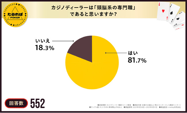 【調査概要】カジノディーラー職業イメージ調査【調査期間】2025年1月30日~2025年1月31日【調査対象】全国20歳以上男女(調査モニター)【サンプル数】ポーカーを知る552名【調査委託】crestep合同会社