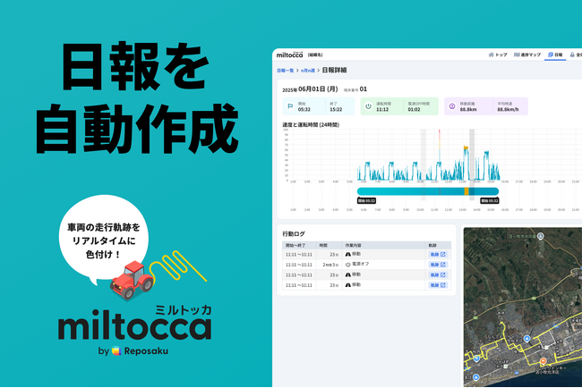 エゾウィン株式会社(本社:北海道標津町、代表取締役:大野 宏、以下「当社」)はこのたび、誰でも簡単に使える動態管理ツール「ミルトッカ」に、新たに「自動日報機能」を追加したことをお知らせします。本機能は、車両の電源に専用端末を挿しておくだけで、1日の走行ルートや稼働記録、速度などの情報を含んだ日報を毎日自動で作成します。これまで日報作成にかけていた時間をゼロにし、より重要な業務に集中できる環境作りを支援します。