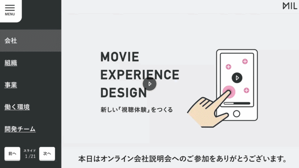 「Recruit MIL」を活用した会社説明会のサンプル。気になった項目をクリック・タップしながら自由に視聴できる。
