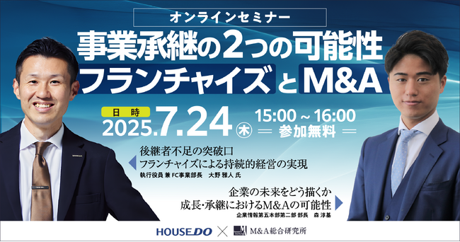株式会社M&A総合研究所(本社:東京都千代田区、代表取締役社長:佐上 峻作、以下「当社」)は、2025年7月24日(木)にM&A・事業承継に関するウェビナーを開催いたします。