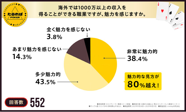 「海外では1000万以上の収入を得ることができる職業ですが、魅力を感じますか」というアンケートを実施したところ、魅力的だとする回答は全体の80%以上に。非常に魅力的(38.4%)、多少魅力的(43.5%)