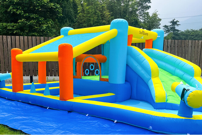 スライダープールで遊び、スイカ割りで盛り上がる!