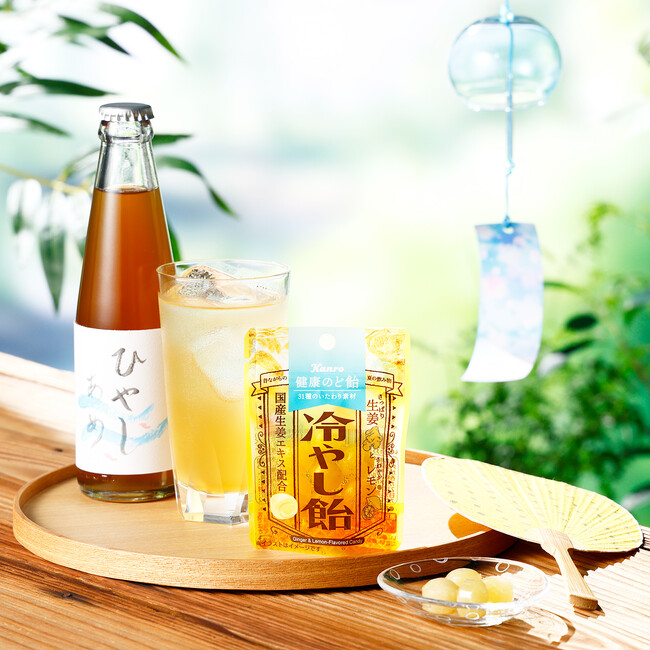 暑い季節も日々の暮らしをいたわってほしいという想いから、カンロでは「健康のど飴」シリーズ初となる「健康のど飴冷やしあめ」を開発しました。国産生姜エキスを使用した”生姜レモン味”で、飴粒の中のペーストで冷やし飴のとろりとした蜜感を表現。パッケージは透明包材を使用し江戸切子をモチーフとした、夏の涼を感じるデザインに仕上げました。