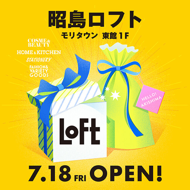 株式会社ロフト(東京都渋谷区/代表取締役社長 安藤公基)は、2025年7月18日(金)に「昭島ロフト」を「モリタウン」(東京都昭島市/運営会社:昭和飛行機都市開発株式会社)東館1階にオープンいたします。「昭島ロフト」が出店する「モリタウン」は、昭島駅直結の大型商業施設で、青梅方面や埼玉方面からのアクセスも良好な立地につき、広域からの集客も見込め、今後も成長が期待できるマーケットエリアであるといえます。昭島ロフトは、「モリタウン」の新しい魅力要素の一つとして加わり、日頃よりロフトをご愛顧いただいているお客さまはもとより、新たにご来店いただくお客さまに向けて、最新のトレンドを踏まえ、旬の雑貨を通してロフトならではの新しい売場づくりを展開します。季節に合った商品の集積をはじめ、オープニング企画のお買上げ特典としてオリジナルエコバッグのプレゼントやロフトアプリのお得なキャンペーンも予定しています。
