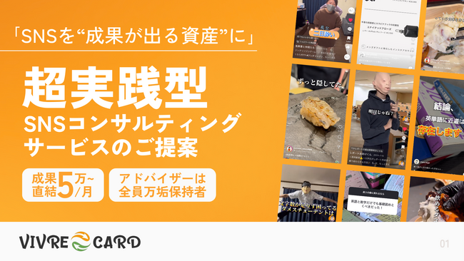 株式会社VIVRE CARD(本社:愛知県一宮市、代表取締役:中原龍士朗)は、2025年7月より、SNSを確実に資産化する『超実践型SNSコンサルティング』サービスを正式リリースしました。本サービスは、広告費0円・SNS戦略のみで40万人ユーザー(MAU12万人)を獲得、M&A売却を実現した代表の実績(レポートお助けくん:フォロワー7.7万人)をベースに、企業のSNSアカウントを"投稿作業"から"成果直結の仕組み"へと変革する完全伴走型支援です。