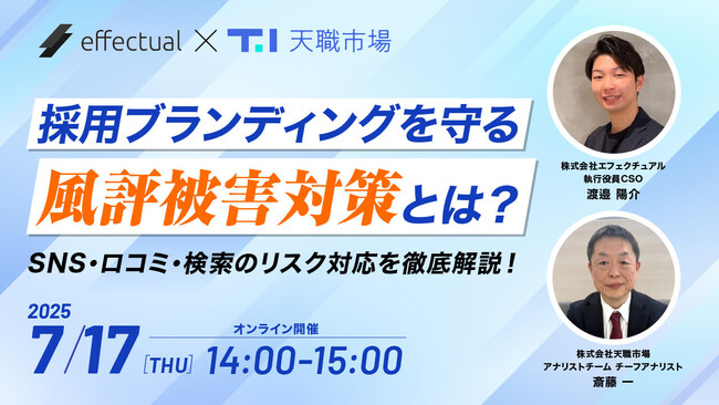 共催は、採用ブランディング支援に強みを持つ株式会社天職市場と、企業のレピュテーション対策に10年以上取り組む株式会社エフェクチュアル。