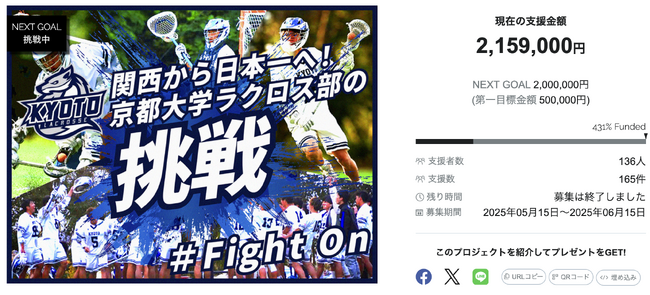 先日実施した京都大学男子ラクロス部のクラウドファンディングでは、多くのご支援をいただき最終Goalとして設定した200万円まで達成し、その後も多くのご支援をいただき終了いたしました。