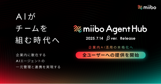 ノーコードで誰でも実用的な会話型AIを構築できるプラットフォーム「miibo」を提供する株式会社miibo(所在地:東京都港区、代表取締役CEO:功刀雅士)は、点在する自社独自のAIエージェントを一元管理し自律的なチームとして協働させる次世代プラットフォーム「miibo Agent Hub」のβ版を2025年7月14日に正式リリースします。